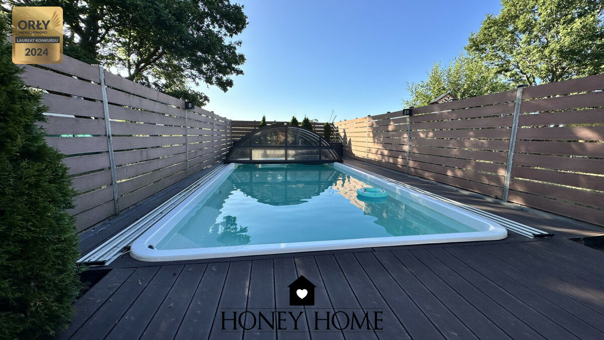 - duży ogród z basenem wyłożony deską tarasową kompozytową