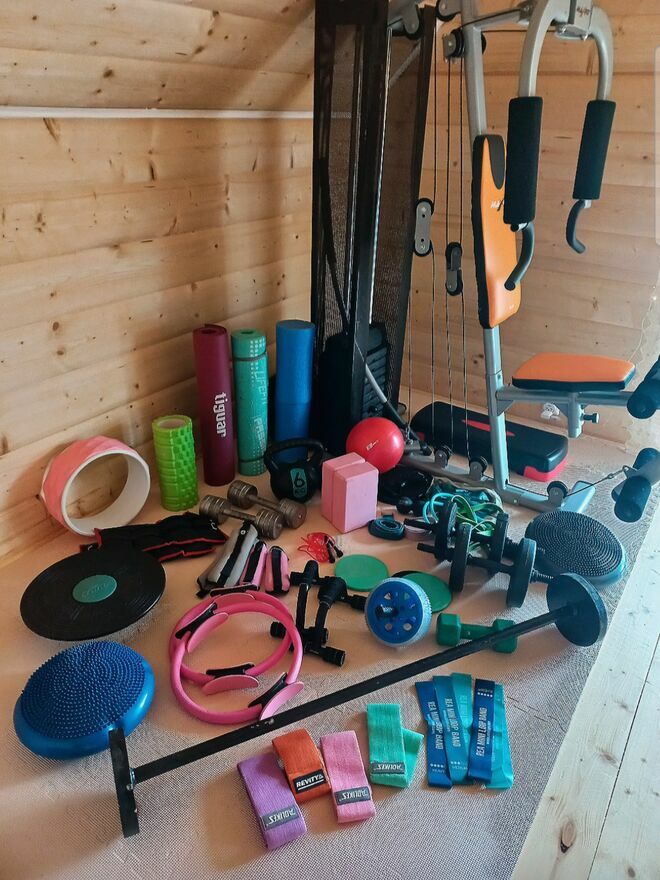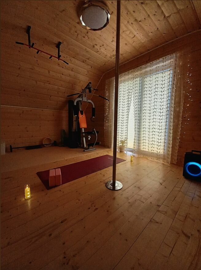 Miejsce wyposażone w różnorodny sprzęt fitness : power band , mini band , magic circle , rollery , maty , piłki , kostki do jogi , paski, taśmy, obciążniki , poduszki sensomotoryczne oraz sztangę, step, drążek, kamizelkę 15 kg , hantle , atlas, TRX i rurę do pole dance .